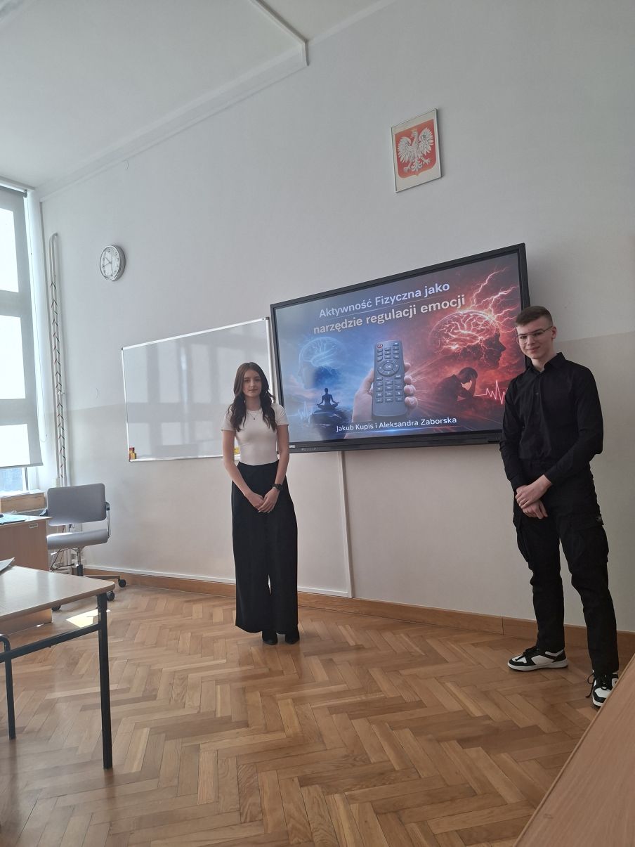 Uczniowie przygotowali prezentację pt.: Aktywności fizyczna jako narzędzie regulacji emocji oraz odpowiadali na pytania zadawane przez komisję konkursową. Trzymamy kciuki za wyniki olimpiady.